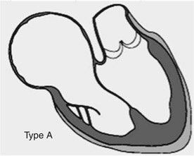 En el tipo A de Carpentier, el volumen del ventrículo derecho funcional es adecuado y la porción atrializada es relativamente pequeña, de modo que la geometría global del ventrículo se aproxima a la normal. Las valvas septal e inferior presentan un desplazamiento apical discreto y cierta displasia (engrosamiento, irregularidad de bordes, inserciones anómalas), pero conservan una longitud y superficie suficientes para coaptar con la valva anterior. Esta última suele ser grande, delgada, bien delaminada y con redundancia moderada, a menudo con aspecto “en vela”, aunque sin fenestraciones extensas ni tethering severo, lo que limita la regurgitación tricuspídea. El anillo tricuspídeo puede encontrarse mínimamente dilatado y el miocardio de la porción atrializada solo muestra adelgazamiento leve, sin áreas aneurismáticas ni fibrosis extensa, mientras que el ventrículo derecho funcional mantiene grosor y trabeculación relativamente conservados. La aurícula derecha está dilatada de forma discreta o moderada, en ocasiones con focos de fibrosis endocárdica, pero sin la enorme distensión observada en formas más avanzadas. La repercusión principal suele ser el riesgo de arritmias supraventriculares por dilatación auricular o presencia de vías accesorias, por lo que el seguimiento se centra en la vigilancia electrocardiográfica y en la valoración periódica de la regurgitación tricuspídea, reservando la cirugía para casos con progresión de síntomas o dilatación ventricular.